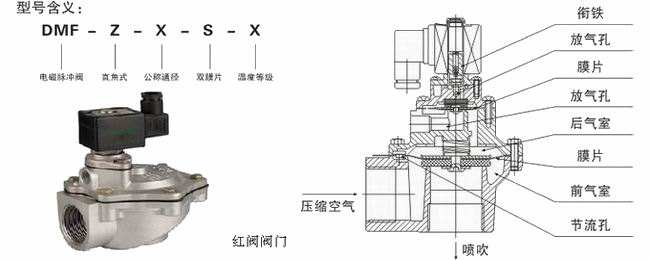 直角式脈沖閥的特征是閥的空氣進(jìn)出口成90°直角。直角式脈沖閥的構(gòu)造圖如下,閥內(nèi)的磨片把脈沖閥分成前后兩個氣室,當(dāng)接通壓縮空氣時,壓縮空氣通過節(jié)流孔進(jìn)入后氣室,此時后氣室壓力將膜片緊貼閥的輸出口,脈沖閥處于”關(guān)閉“狀態(tài)。